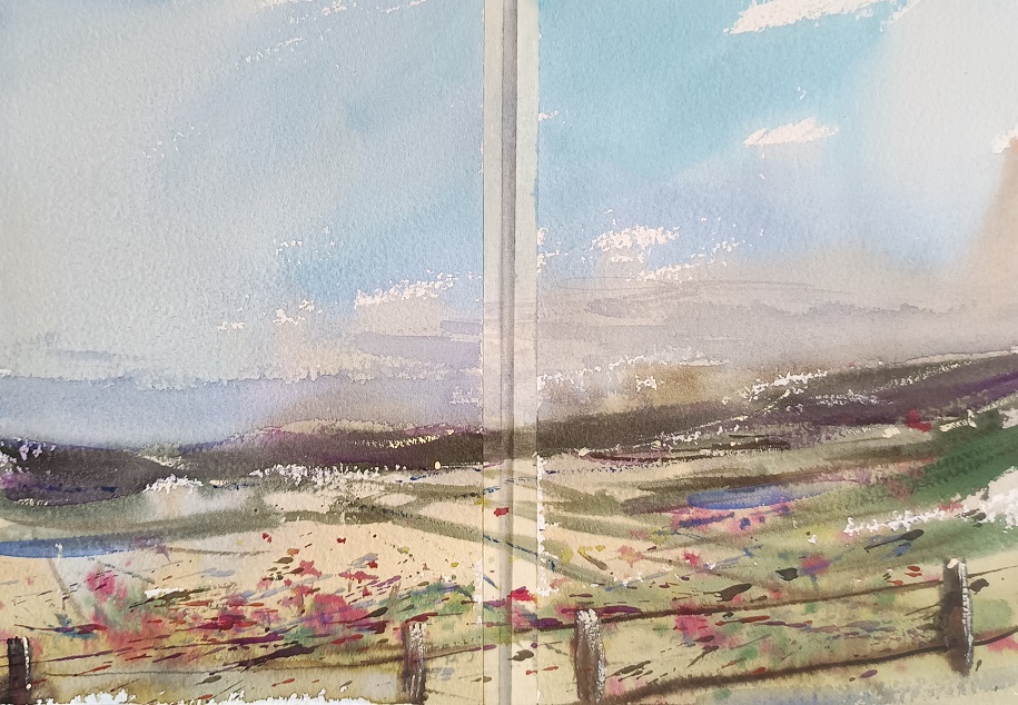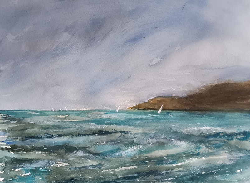 Un díptic i una marina agitada per aprofitar papers usats. El díptic és fluix de to, i la marina és, només, una pràctica (com tot el que faig). N’hauria de fer una cada dia per arribar qualque dia a la suficiència… Somnis, tanmateix! Present el díptic en el tauler, i les dues peces separades. Segurament acabarà a la paperera qualque dia. La marina també. Ara reposen en el caramull de feina feta.