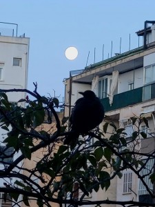 Aquests dies tenim al terrat de casa un il.lustre visitant: una mèrlera femella amb el cap desplomat, que només li queden alguns plomissons descambuixats. Ve amb la primera llum del sol i està una estona parada en les plantes enfiladisses que hi tenim en cossiols, després bóta en terra, hi fa saltets, cerca, grufa en la terra dels altres cossiols… S’hi està molt de temps, perquè es veu que s’hi deu sentir a gust i segura, i pot sentir-s’hi perquè ningú de nosaltres o li farà cap mal ni consentiria que n”hi vengués qualcun. I clar, hi cerca alguna cosa per espipellar. Com és ben entenedor. Avui, ben dematí, mirava la lluna, l’aucell. Potser hi dialogava. Quins eren els temes de la seva conversa? Imitant malament un poema de Li Bo (crec, o era de Matsuo Bashô), m’atrevesc a dir que, avui, en aquella estona, la lluna, la merla i jo existíem. Tranquils, segurs, a gust. Com deia Sant Francesc d’Assis: “Gràcies, germana mèrlera!”